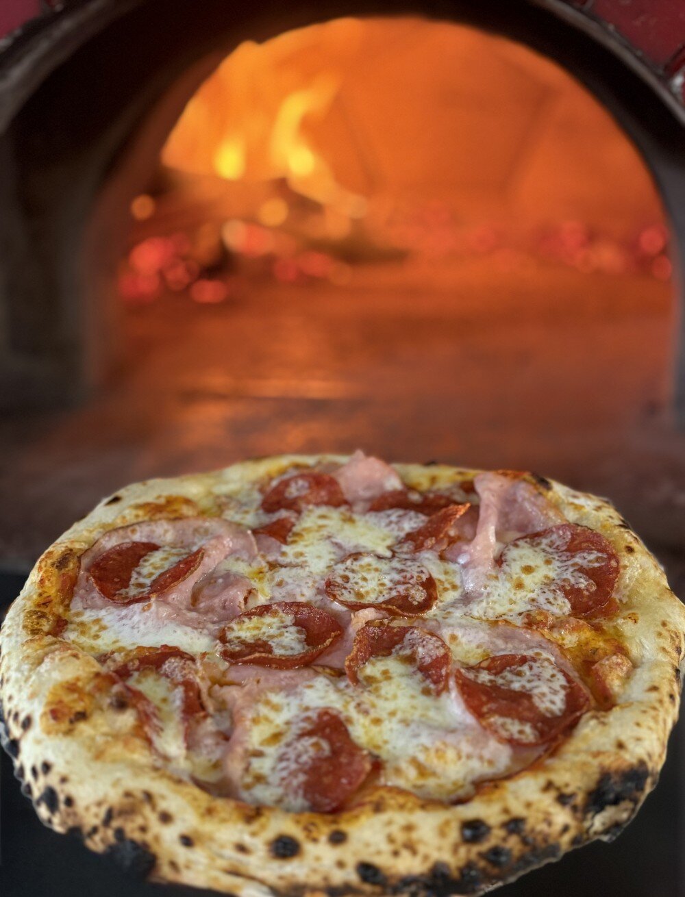 Сытная пицца с ветчиной и пеперони, приготовленная в дровяной печи Состав: сыр моцарела, томатный/сливочный соус, ветчина, пеперони, оливковое масло