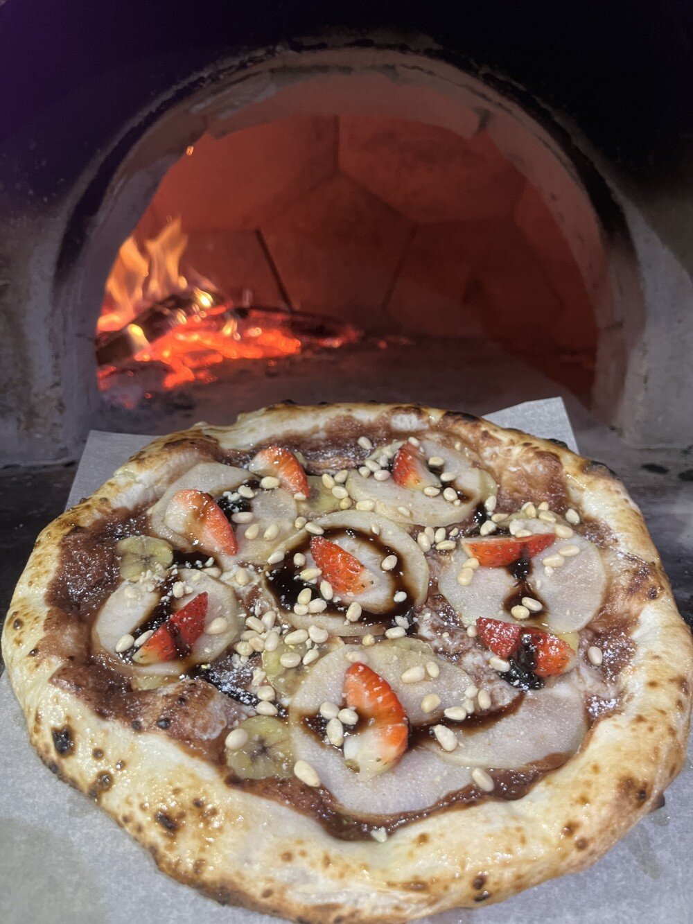Пицца для любителей фруктов и сладкого. Моцарелла, банан и груша — гармонично сочетаются с шоколадным топингом и кленовым сиропом.