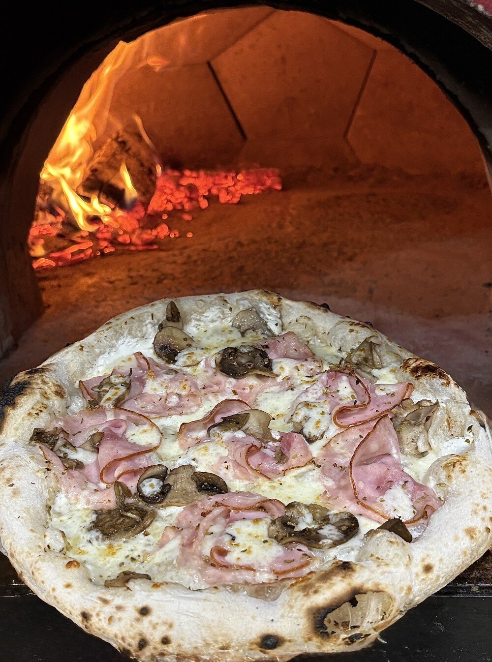 Состав: сыр моцарелла, сливочный соус, ветчина, шампиньоны, оливковое масло
